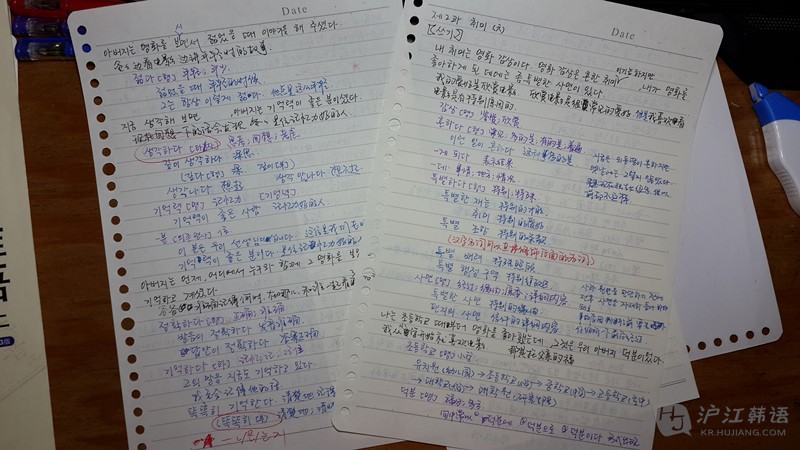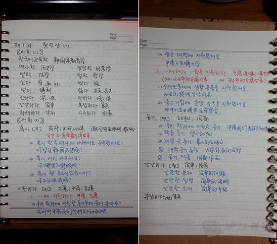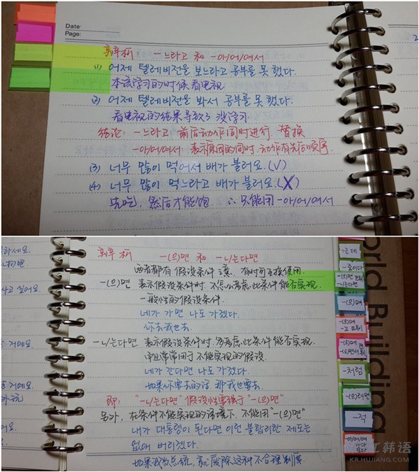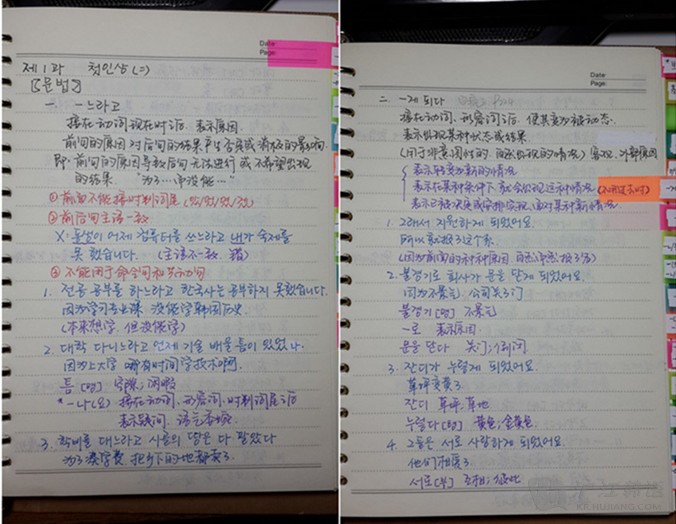 课件里写的、老师说的,自己查资料补充的都写下来,说明性的内容写完,下面就是例句了,课件里的例句原封不动抄下来,生词以及涉及到的其他知识点也标记出来,也可以解释一下语境,帮助理解。如果语法比较难,可以多搜集一些例句。另外,有时候语法书上内容太多太乱,如果用处不大我也懒得都抄。直接把对应的页数标在旁边。>>>延世韩语4-6册连读